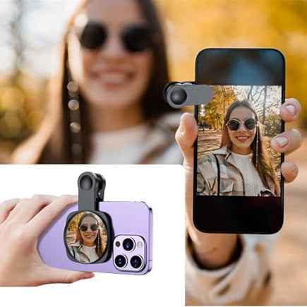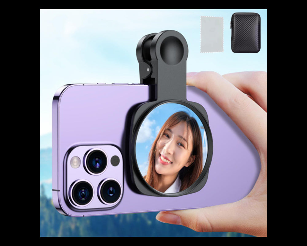 Espejo portátil con soporte universal para smartphone que facilita la captura de autorretratos con estabilidad y precisión. Diseñado con superficie reflectante de calidad óptica superior que reproduce fielmente los detalles faciales sin distorsiones. El gancho ajustable se adapta a diferentes tamaños de dispositivos móviles, permitiendo múltiples ángulos de posicionamiento. Compacto y ligero, es la solución práctica para fotógrafos, viajeros y creadores de contenido que priorizan portabilidad y claridad visual sin dependencia de fuentes de energía.